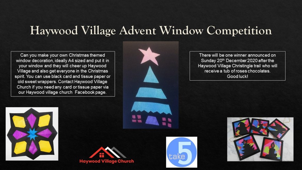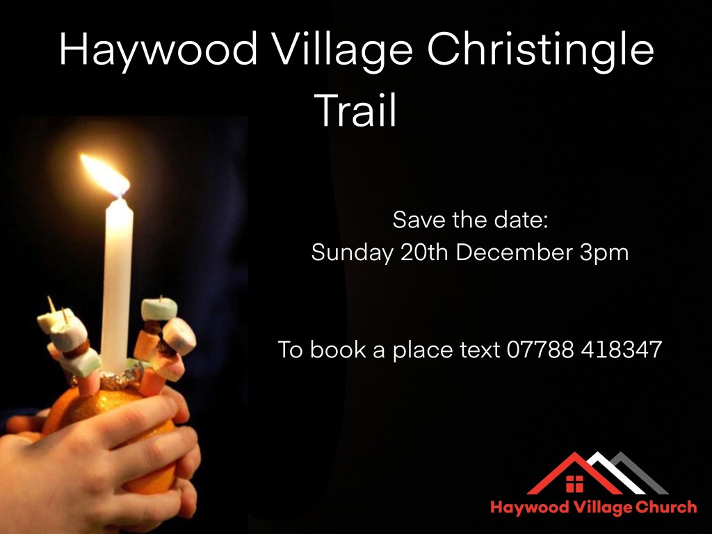 This Tea and Toast Church event is for everyone.There will be a nativity and local Haywood Village Children are encouraged to join in. Please come dressed as your favourite nativity character and we will call you on stage.Adults are invited to join in the optional bad taste Christmas jumper competition! Prize for the winner.Come and make your own Christingle and join in with the carols by candlelight to get in the Christmas mood. Mince pies and coffee served afterwards.